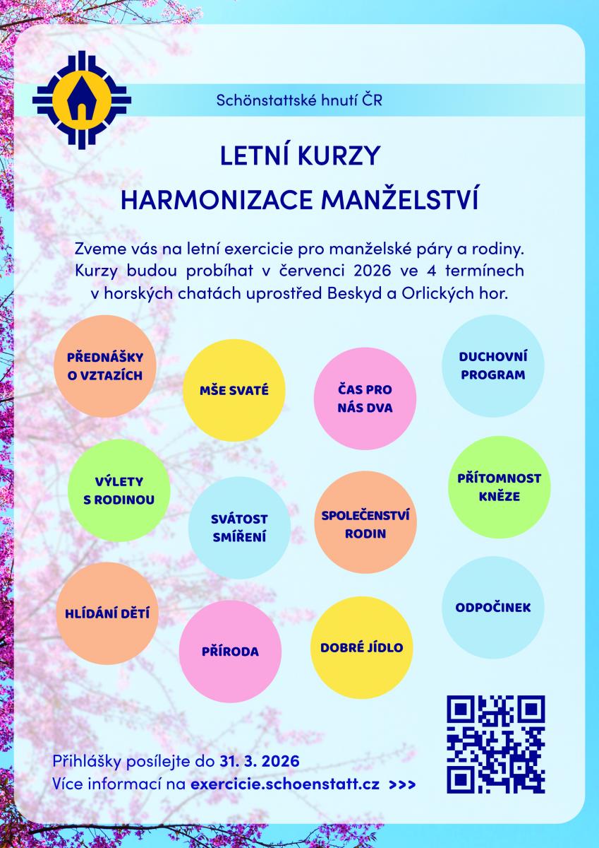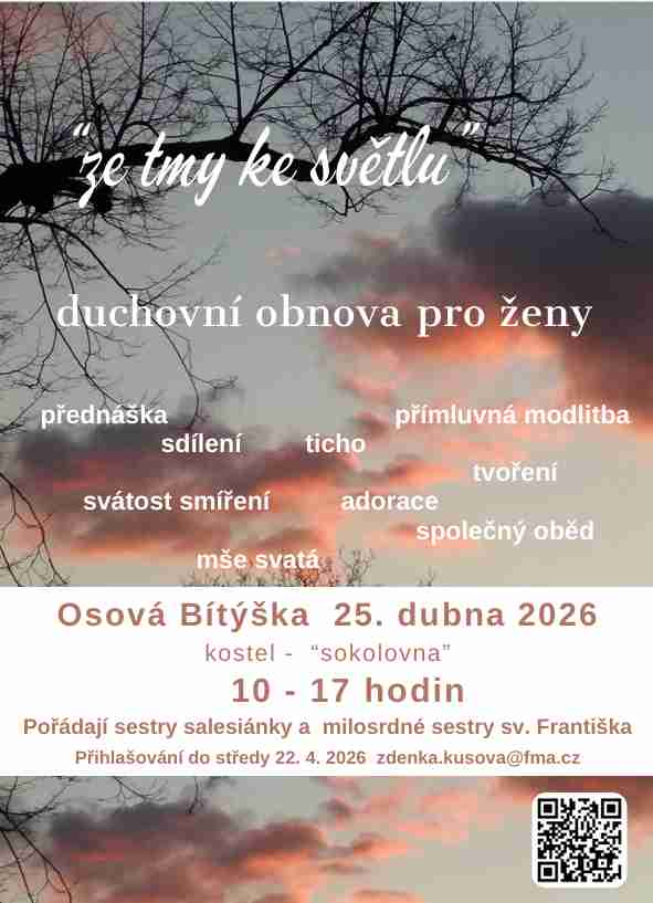 Duchovní obnova pro ženy: Osová Bítýška 25. dubna 2026, kostel – „sokolovna“ od 10 – 17 hodin. Pořádají sestry salesiánky a milosrdné sestry sv. Františka. Přihlašování do středy 22. 4. 2026 zdenka.kusova@fma.cz. Podrobnosti na plakátku zde