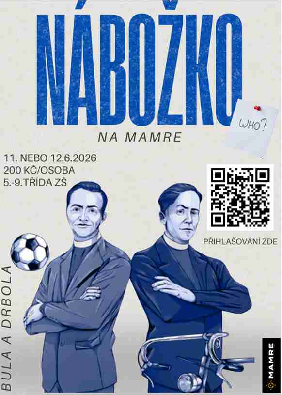 NÁBOŽKO na Mamre: pro děti 5. – 9. třída ZŠ, 11. nebo 12. 6. 2026. Téma Bula a Drbola. Přihlašování QR kódem na plakátku. - plakátek zde